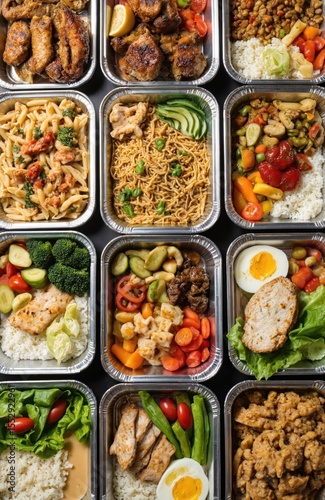 Top view of lunch boxes with various food for delivery. Office catering concept. Packed meals in containers meat, pasta, noodles, eggs, rice and fresh vegetables for balanced diet.