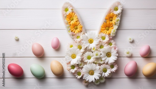 Top view of many daisies flowers in shape of a Easter bunny head on white wooden table with Easter eggs