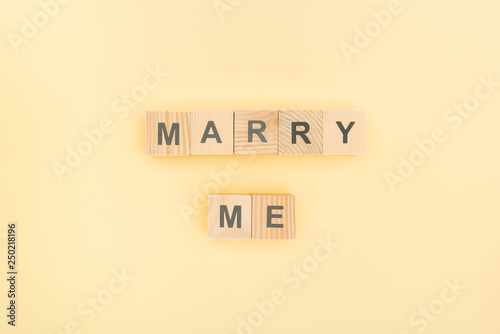 top view of marry me lettering made of wooden blocks on yellow background