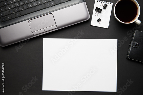 Top view of modern black office desk with laptop, notebook, pencil and a lot of things. Flat lay table layout. Copy space for text.