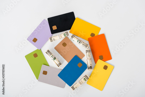 top view of multicolored credit card templates near cash rolls isolated on white