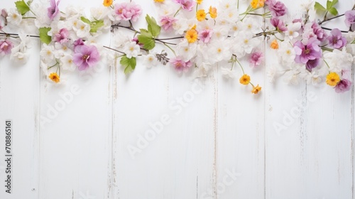 Top view of multicolored purple, yellow spring flowers on a white wooden background with space to copy. Mockup, Spring composition, banner for advertising.