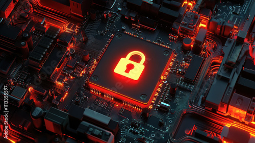 top view of network security device featuring glowing padlock symbol, representing cybersecurity and data protection. intricate circuit board design highlights technology and innovation