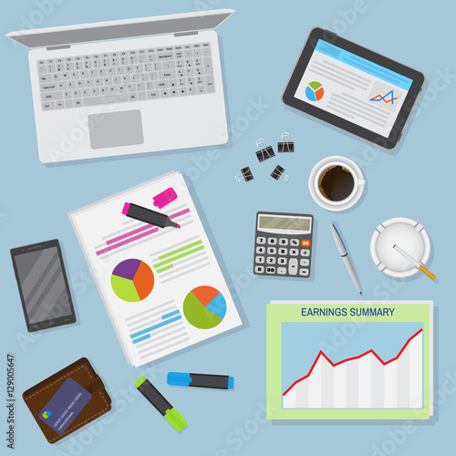 Top view of office desk background including laptop, digital devices, financial and business objects.