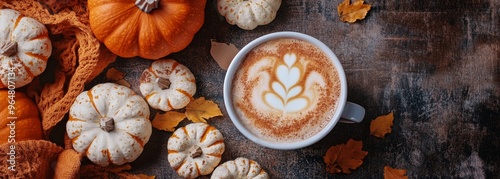 Top view of pumpkins and pumpkin coffee latte cup autumn fall composition background