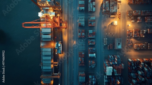 top view of realistic the big shipyard, a lot of storage, loading crane, truck, realistic twilight sky on background --chaos 10 --ar 16:9 --v 6.1 Job ID: 7e598dad-0947-4547-a037-5bd0808724a9