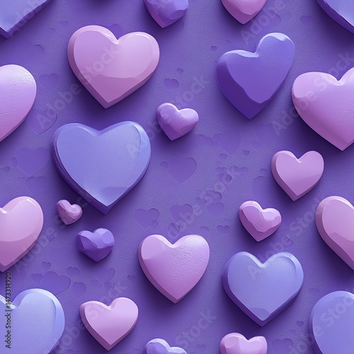 Top view of scattered 3D pastel purple heart shapes creating a seamless romantic background. --tile