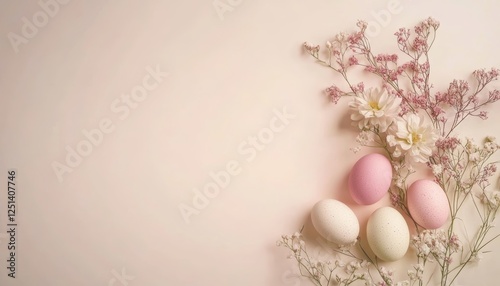 top view of spring flowers and colorful Easter eggs on plain color background with copyspace.