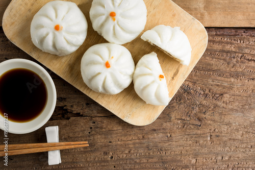 top view of steamed chinese bun (baozi) on cutting board served with soy sauce, close up. popular dim sum food menu.