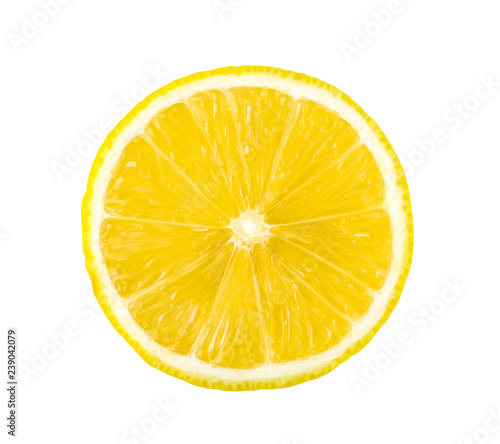Top view of textured ripe slice of lemon citrus fruit isolated on white background