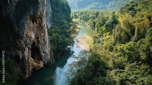 Top view of the Tham Nam Cave in Vang Vieng, with a river running through its dark, limestone interior.