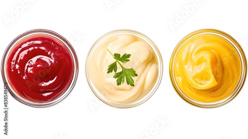 Top view of three different sauces. Fresh and smooth textures. Great for food blogs and recipe websites. AI