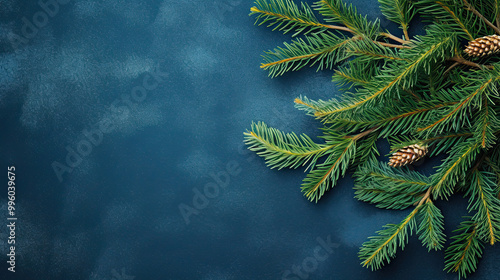 Top view of tree branches with Christmas ornaments and details on a indigo background