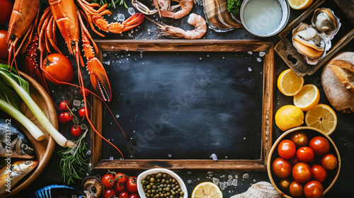 Top view of variety of fresh fish with empty chalkboard for inscription. Seafood restaurante. Copy space. Generative AI