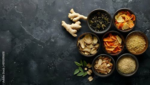 Top view of various herbs and spices in bowls on a dark stone background. Ingredients for cooking and seasoning.