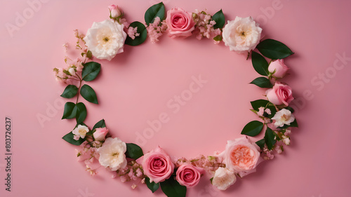 Top view of white empty circle and spring flowers pink roses on pink background with copy space