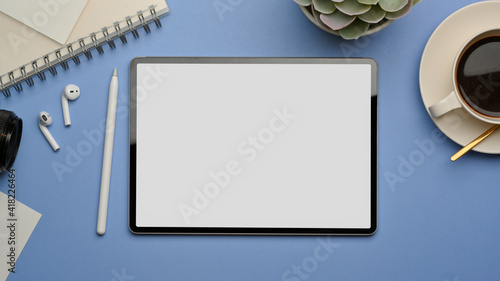 Top view of workspace with digital tablet, coffee cup, stationery and accessories