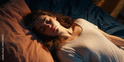 Top view of young woman sleeping in her bed at night. Girl sleeping with closed eyes