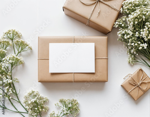Top view photo with paper card, gift box and gypsophila flowers on white background with empty space