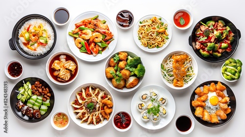 Top View Realistic Group of Chinese Food on Plain White Background in HD 8K Resolution