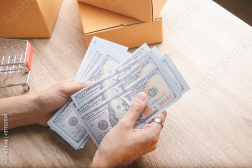 Top view shot of merchandise table with a lot of earning money (mockup banknote) in hands from e-commerce which selling products via online shows boxes and clothes for shipping to customers