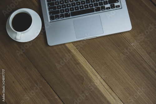 Top view table office with notebook, laptop, mobile, coffee cup, and pen with copy space on wooden table. Business concept.