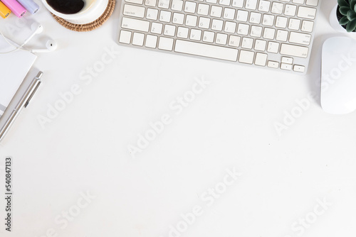 Top view white office desk with wireless keyboard, coffee cup and notepad. Copy space for your text.