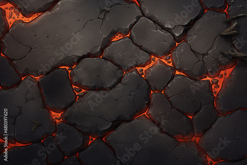 Top-down, illustrated asset of a volcanic plain, fissures glowing, game background setting, material texture