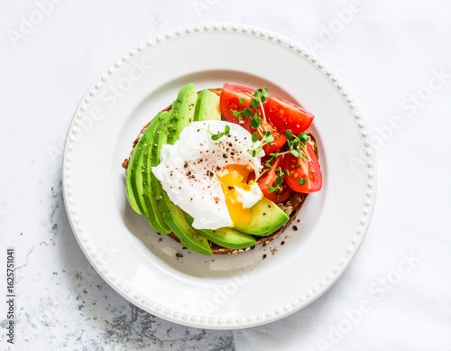 Top-down view of a healthy breakfast with sliced avocado on whole grain toast, cherry tomatoes, poached egg