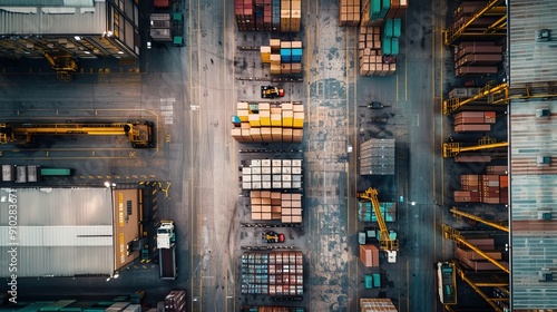 Top-down view of a warehouse filled with organized boxes, pallets, and industrial equipment for logistics and storage operations. AI generated image