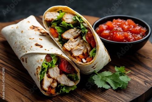 top-down view of two chicken wraps cut in half, showcasing the fillings,