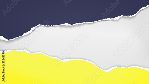 Torn, ripped pieces of horizontal blue and yellow paper with soft shadow are on white background for text. Vector illustration