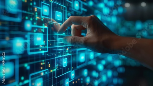 Touchscreen interface Close-up of a hand touching a virtual button on a futuristic interface