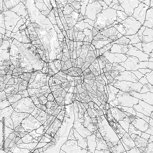Toulouse Area Map with Labels and Neighborhoods - One color, minimalistic design