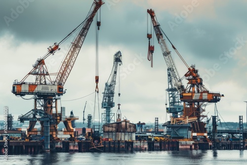 Towering cranes loom over a busy shipping port, their massive structures silhouetted against a cloudy sky, emphasizing the strength of industry.