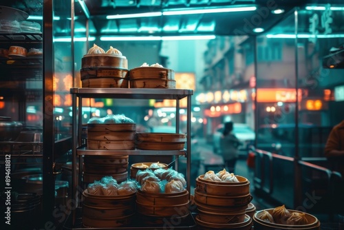 Towering Dim Sum Spread in Vibrant Neon Lit Hong Kong Restaurant Interior