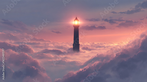 Towering lighthouse emerges from a sea of ethereal clouds bathed in soft sunset light image