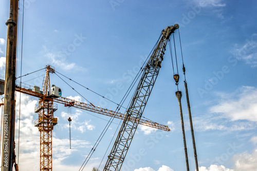 Towers of the cranes. Construction site with cranes against the blue sky.