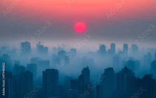 Toxic Cityscape: Urban Skyline Enveloped in Smog with Ominous Red Sun - Environmental Crisis Concept
