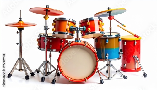 Toy drum set with colorful plastic pieces including bass drum snare cymbals and sticks musical instrument play kit designed to encourage rhythm skills in kids isolated on white background
