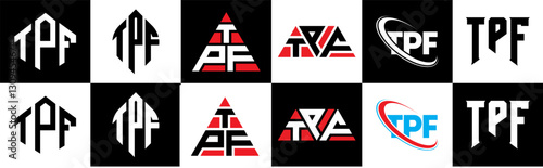 TPF letter logo design in six style. TPF polygon, circle, triangle, hexagon, flat and simple style with black and white color variation letter logo set in one artboard. TPF minimalist and classic logo