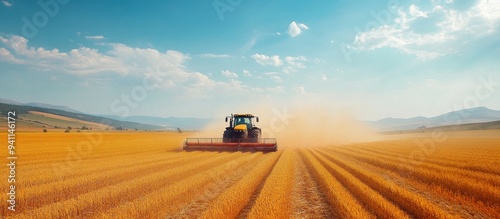 Tractor Harvesting Wheat in a Golden Field Under a Clear Blue Sky with Mountains in the Background