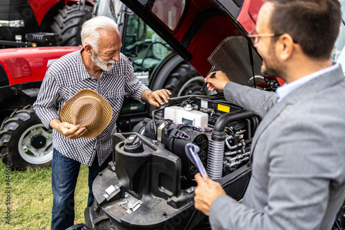 Tractor salesman showing customer specification of brand new agricultural machine.