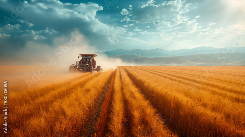 Tractor Working in a Field of Ripe Wheat on a Sunny Day. Generative AI