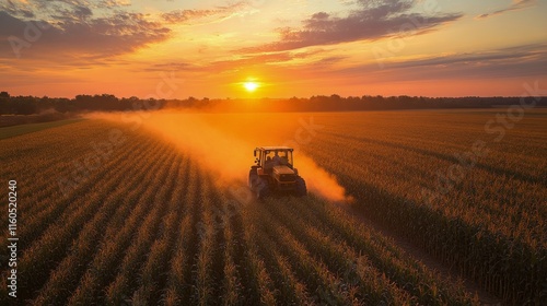 Tractor working in corn field during sunset in rural area with vibrant sky colors