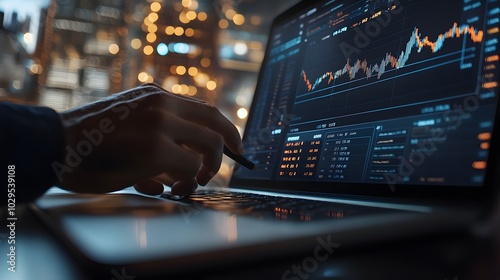Trader analyzing data on virtual screen.Price graph and indicator. Stock market invest and crypto currency. Stock market and business investment.