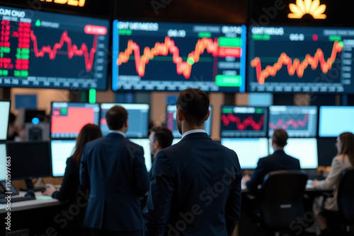 Traders and investors watching stock prices at trading floor in stock exchange. Trader background.
