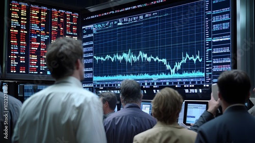 Traders gathered around a large stock chart displayed on a screen in a busy trading room