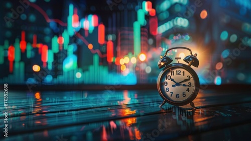 trading background with alarm clock and stock market graph on wooden table