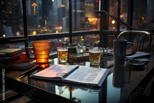 Trading journal and a cup of coffee on a trader's desk for reflection, Generative AI